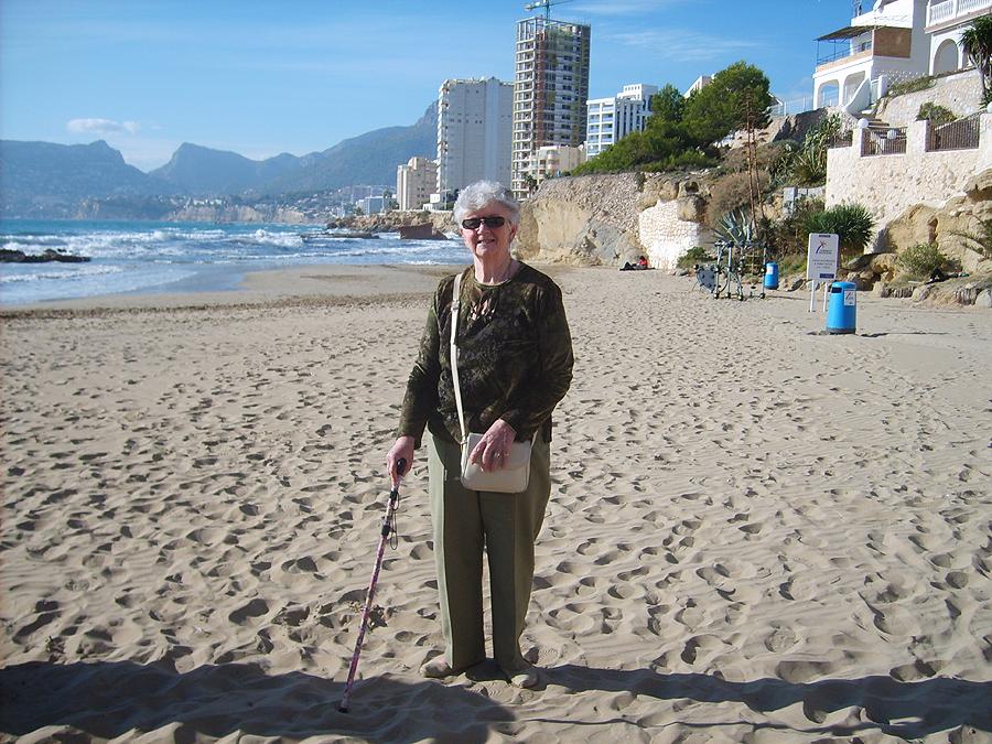 Here's Mum (without her cardigan) in December, on the beach... it's at least 18C..... and look how dark those "reacta-lite lenses are.......